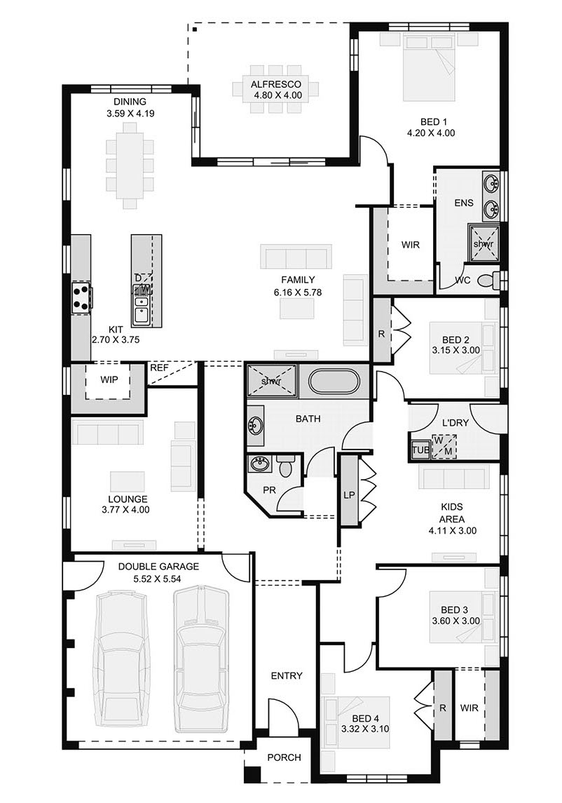 From the moment you enter the Glenburn you know you are in a wonderfully stylish home suitable for growing families. This 4 bedroom home features a master bedroom at the rear of the home, a centrally located lounge/theatre room, main bathroom with separate powder room located next to the other 3 bedrooms which makes homelife convenient. A separate kids area highlights the thoughtful and practical open plan layout that will suit today’s modern family. You can enjoy year-round entertaining with a functional and spacious kitchen and walk in pantry with living and dining spaces which open to a spacious and beautiful alfresco area. This is a high comfort home which is sure to delight.