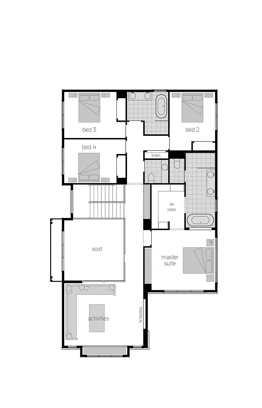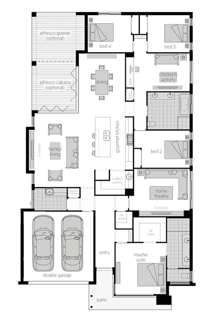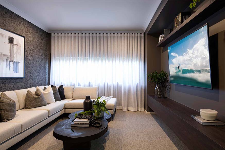Unique and elegant, the Miami Encore provides a level of luxury you’d usually expect from one-off bespoke homes. The straight-forward and simple use of space, combined with the resort-style ambience deliver an ambience that will always draw you home. With the front of the Miami entirely dedicated to a kids’ wing, this home makes perfect sense for families. Three bedrooms, a bathroom with separate WC, study nook and children’s activity make up this large area, where the kids can feel free to kick off their shoes and chill out with friends. And Mum and Dad will love the sanctuary of the huge master suite with large ensuite and spacious walk-in robe to create a world of their own.